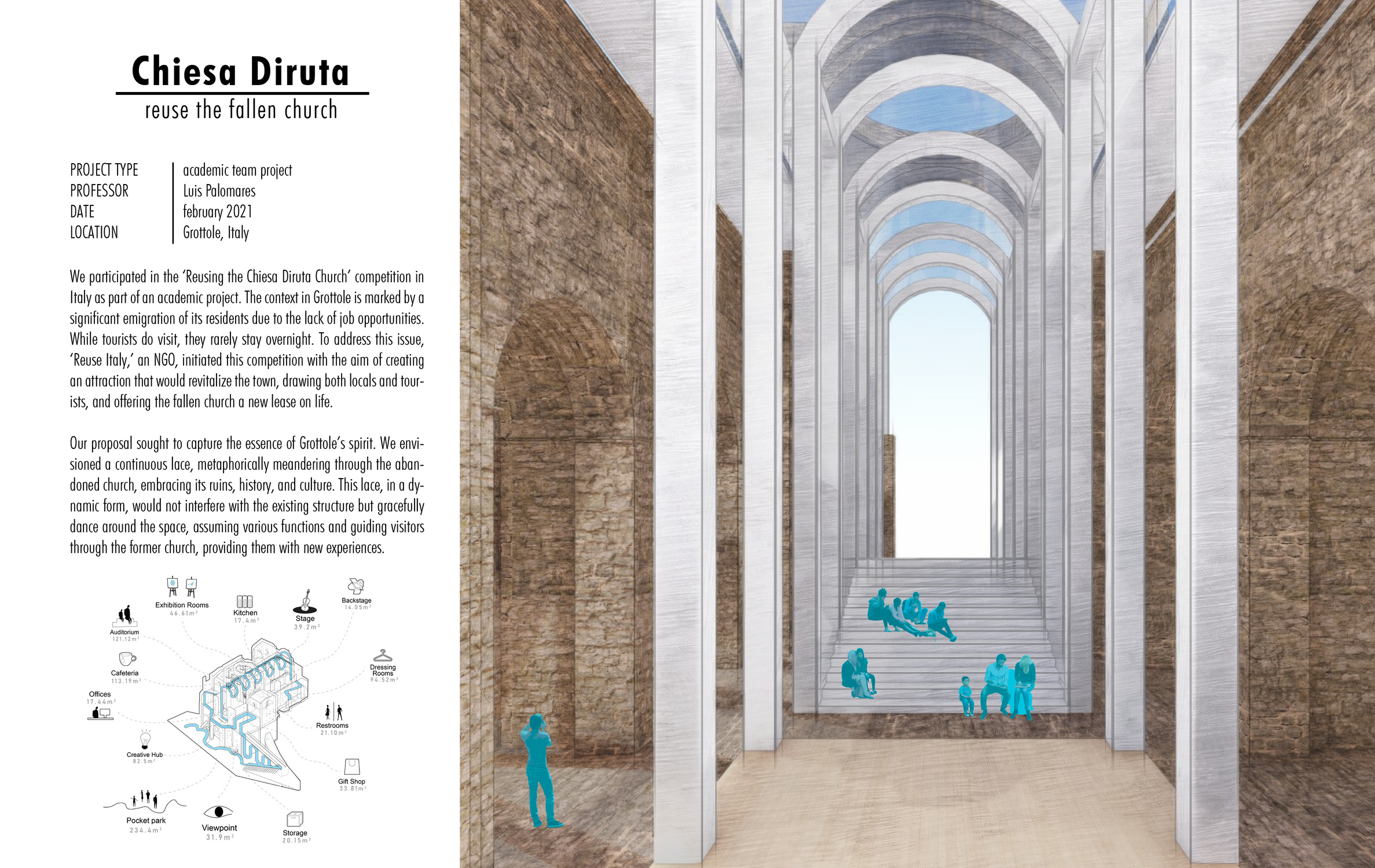 We participated in the ‘Reusing the Chiesa Diruta Church’ competition in Italy as part of an academic project. The context in Grottole is marked by a significant emigration of its residents due to the lack of job opportunities. While tourists do visit, they rarely stay overnight. To address this issue, ‘Reuse Italy,’ an NGO, initiated this competition with the aim of creating an attraction that would revitalize the town, drawing both locals and tourists, and offering the fallen church a new lease on life.