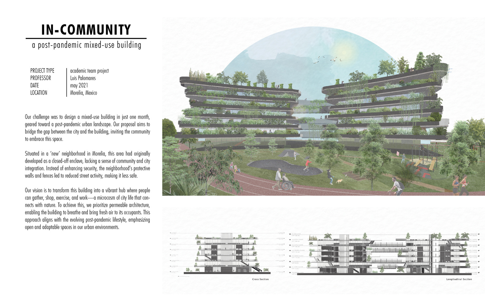 Our challenge was to design a mixed-use building in just one month, geared toward a post-pandemic urban landscape. Our proposal aims to bridge the gap between the city and the building, inviting the community to embrace this space.