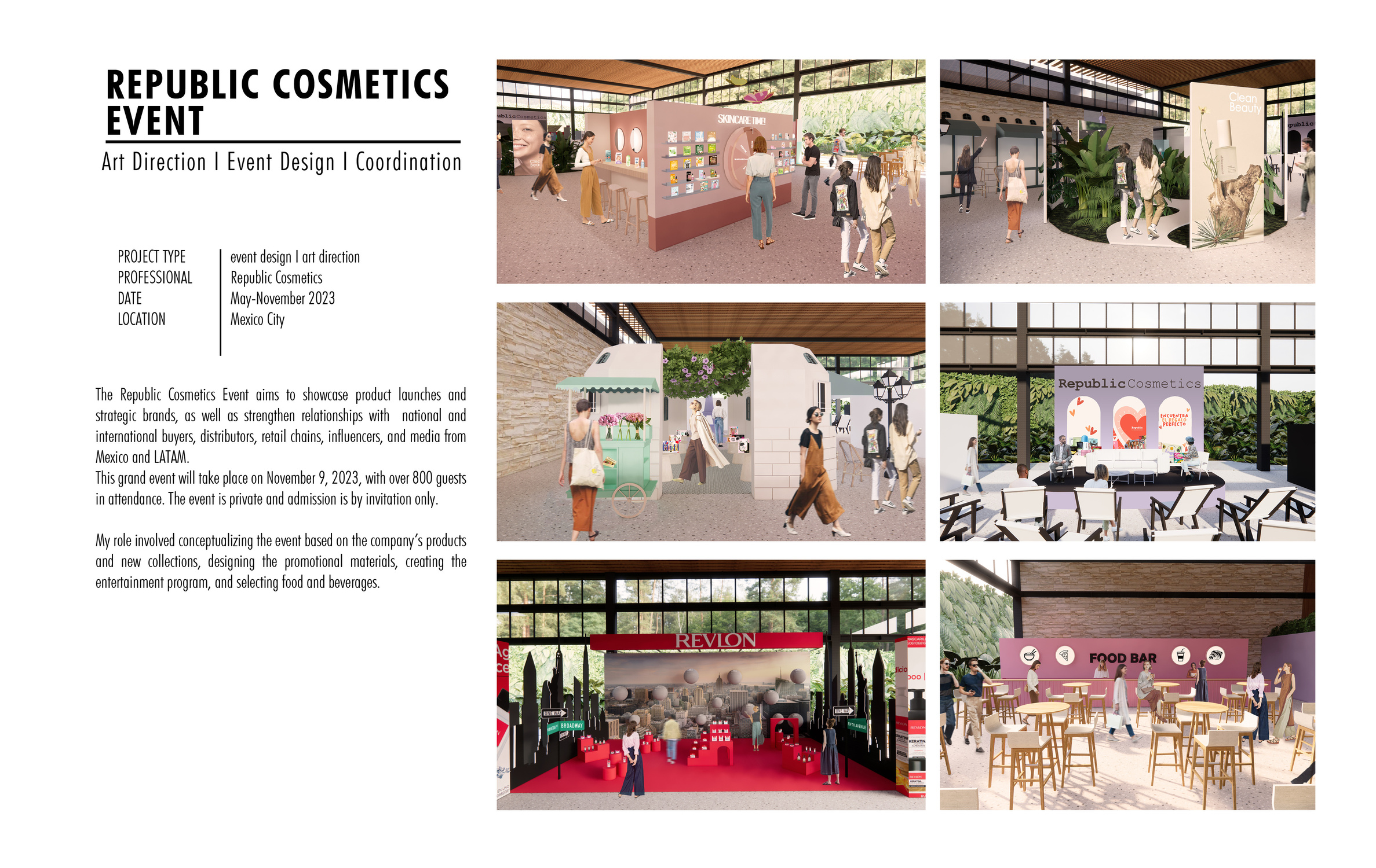 Directed Latin America's largest private event, 'Republic Cosmetics Event,' overseeing all aspects from experience design to culinary offerings. Executed 14 showcase spots for prestigious brands like Disney and Revlon, emphasizing experiential marketing and artistic design. The event attracted an impressive turnout of over 2,500 attendees.