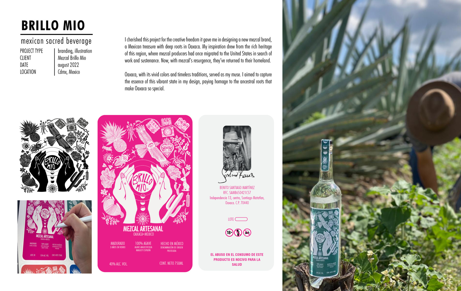 I cherished this project for the creative freedom it gave me in designing a new mezcal brand, a Mexican treasure with deep roots in Oaxaca. My inspiration drew from the rich heritage of this region, where mezcal producers had once migrated to the United States in search of work and sustenance. Now, with mezcal’s resurgence, they’ve returned to their homeland.