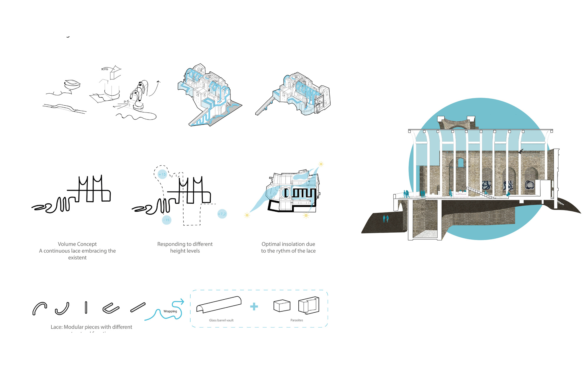 Our proposal sought to capture the essence of Grottole’s spirit. We envisioned a continuous lace, metaphorically meandering through the abandoned church, embracing its ruins, history, and culture. This lace, in a dynamic form, would not interfere with the existing structure but gracefully dance around the space, assuming various functions and guiding visitors through the former church, providing them with new experiences.