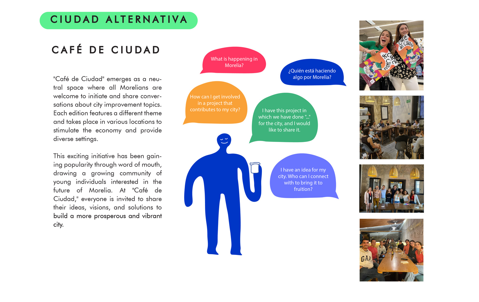 We created a neutral space for all Morelia residents to engage in discussions about city improvement. Each session focuses on different topics and locations, attracting a growing community of young individuals passionate about Morelia’s future.